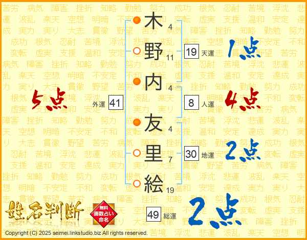 木(4画)野(11画)内(4画) 友(4画)里(7画)絵(19画)