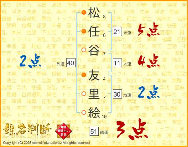 松任谷友里絵さんの総運は51画の3点!