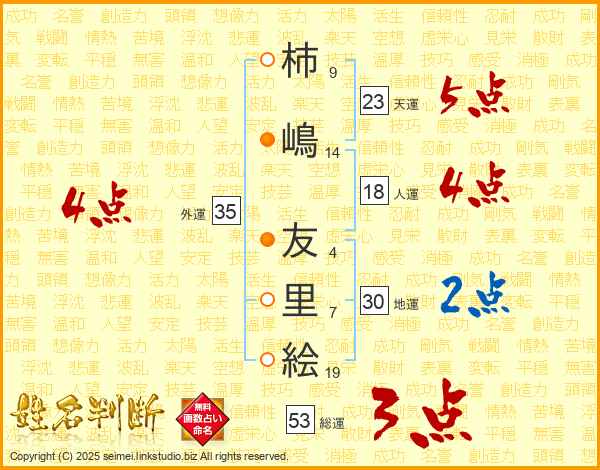 柿(9画)嶋(14画) 友(4画)里(7画)絵(19画)