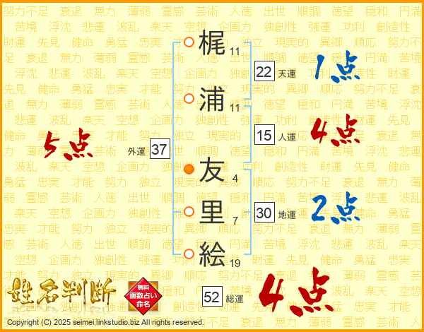 梶(11画)浦(11画) 友(4画)里(7画)絵(19画)