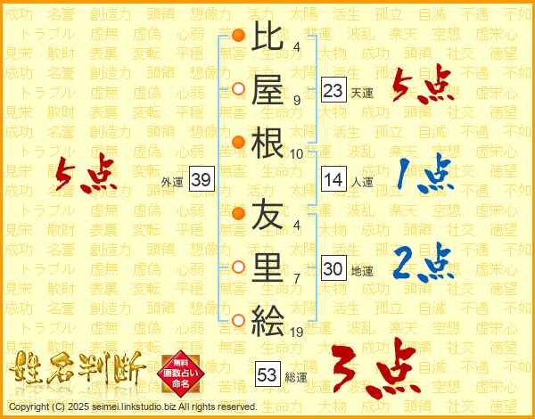 比(4画)屋(9画)根(10画) 友(4画)里(7画)絵(19画)