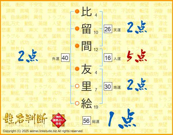 比留間友里絵さんの総運は56画の1点!