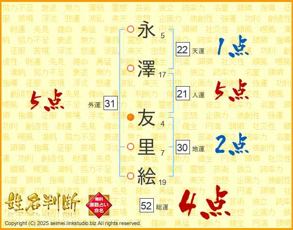永(5画)澤(17画) 友(4画)里(7画)絵(19画)