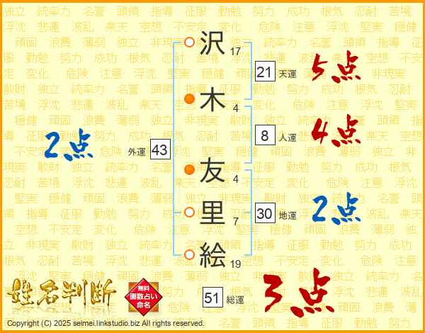 沢(17画)木(4画) 友(4画)里(7画)絵(19画)