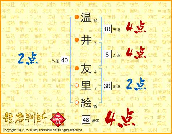温(14画)井(4画) 友(4画)里(7画)絵(19画)