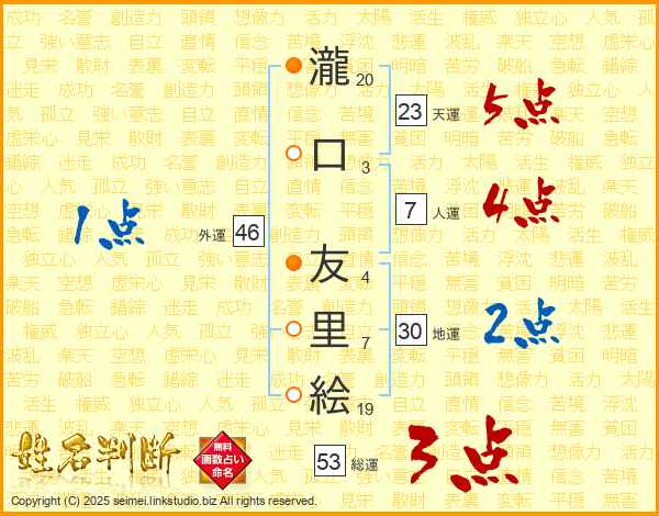 瀧(20画)口(3画) 友(4画)里(7画)絵(19画)
