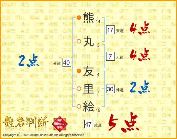 熊(14画)丸(3画) 友(4画)里(7画)絵(19画)