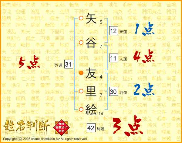 矢(5画)谷(7画) 友(4画)里(7画)絵(19画)