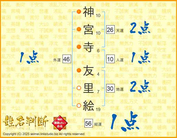 神(10画)宮(10画)寺(6画) 友(4画)里(7画)絵(19画)