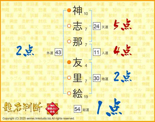 神(10画)志(7画)那(7画) 友(4画)里(7画)絵(19画)