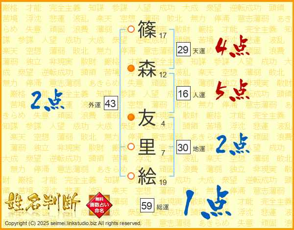 篠(17画)森(12画) 友(4画)里(7画)絵(19画)
