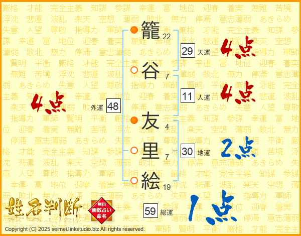 籠(22画)谷(7画) 友(4画)里(7画)絵(19画)