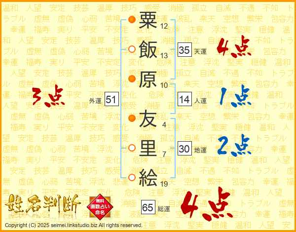 粟(12画)飯(13画)原(10画) 友(4画)里(7画)絵(19画)