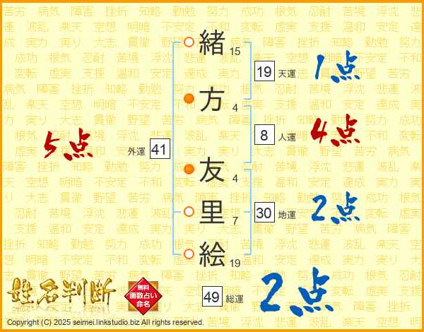 緒(15画)方(4画) 友(4画)里(7画)絵(19画)