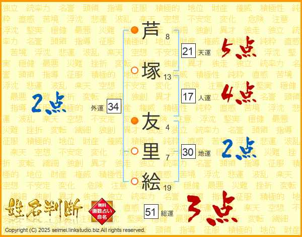 芦(8画)塚(13画) 友(4画)里(7画)絵(19画)