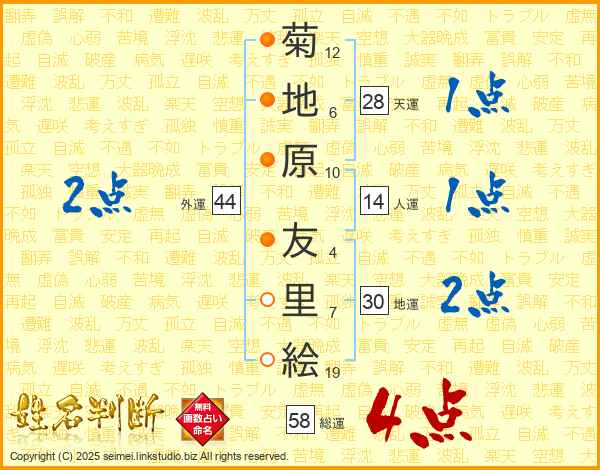 菊(12画)地(6画)原(10画) 友(4画)里(7画)絵(19画)