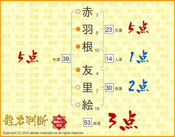 赤羽根友里絵さんの総運は53画の3点!