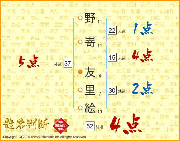 野嵜友里絵さんの総運は52画の4点!