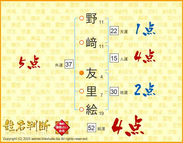 野(11画)﨑(11画) 友(4画)里(7画)絵(19画)