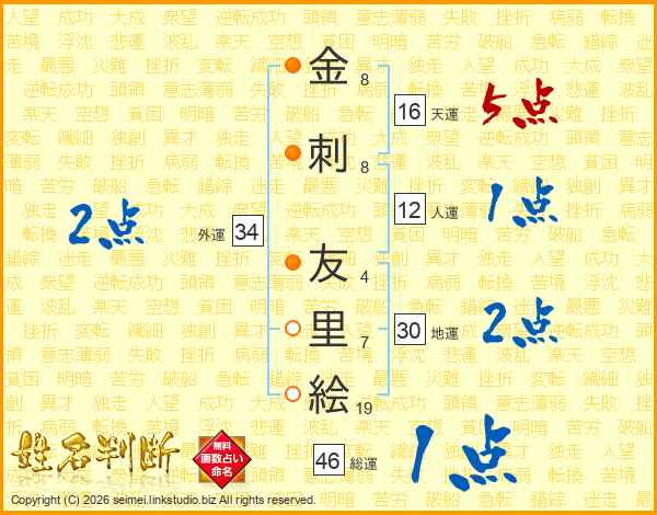 金(8画)刺(8画) 友(4画)里(7画)絵(19画)