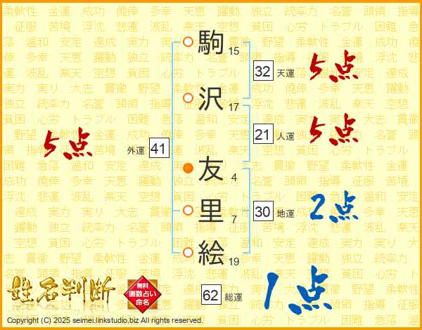 駒(15画)沢(17画) 友(4画)里(7画)絵(19画)