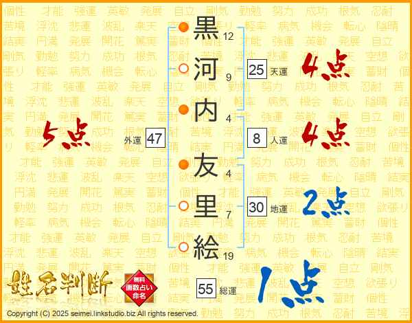 黒(12画)河(9画)内(4画) 友(4画)里(7画)絵(19画)