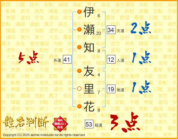伊(6画)瀬(20画)知(8画) 友(4画)里(7画)花(8画)