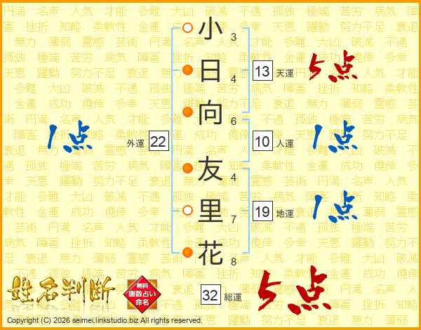 小日向友里花さんの総運は32画の5点!