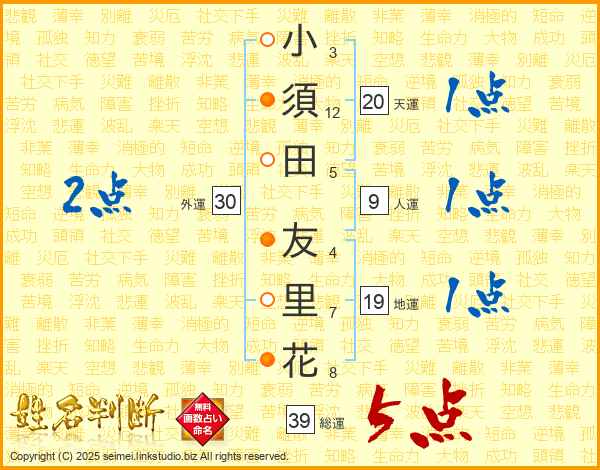 小(3画)須(12画)田(5画) 友(4画)里(7画)花(8画)