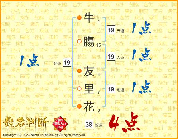 牛膓友里花さんの総運は38画の4点!