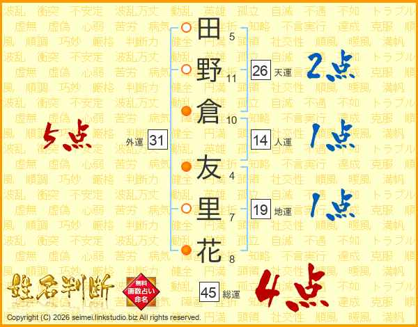 田野倉友里花さんの総運は45画の4点!