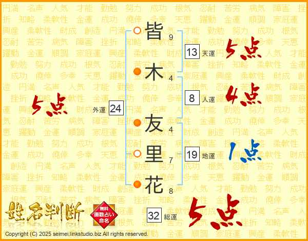 皆(9画)木(4画) 友(4画)里(7画)花(8画)