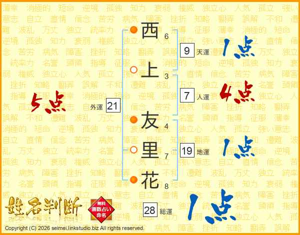 西(6画)上(3画) 友(4画)里(7画)花(8画)