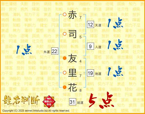 赤(7画)司(5画) 友(4画)里(7画)花(8画)