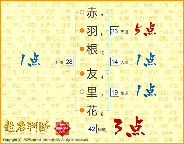 赤(7画)羽(6画)根(10画) 友(4画)里(7画)花(8画)
