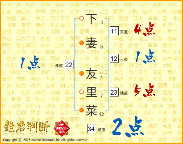 下(3画)妻(8画) 友(4画)里(7画)菜(12画)