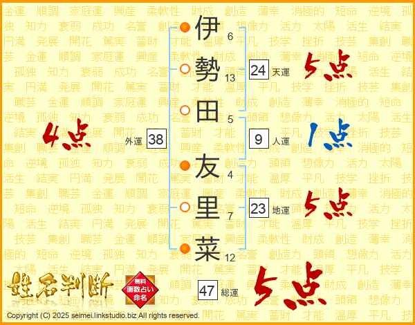伊(6画)勢(13画)田(5画) 友(4画)里(7画)菜(12画)