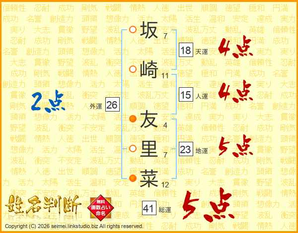 坂(7画)崎(11画) 友(4画)里(7画)菜(12画)