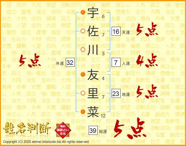 宇(6画)佐(7画)川(3画) 友(4画)里(7画)菜(12画)