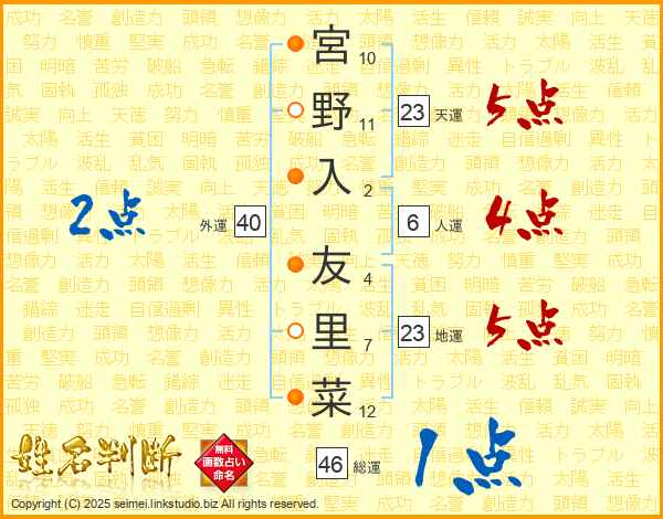 宮(10画)野(11画)入(2画) 友(4画)里(7画)菜(12画)