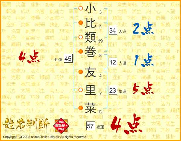 小(3画)比(4画)類(19画)巻(8画) 友(4画)里(7画)菜(12画)