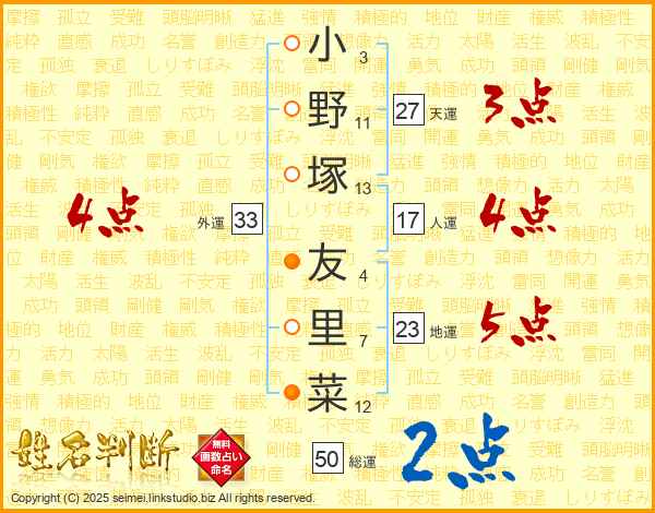小(3画)野(11画)塚(13画) 友(4画)里(7画)菜(12画)