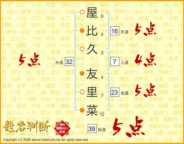 屋(9画)比(4画)久(3画) 友(4画)里(7画)菜(12画)