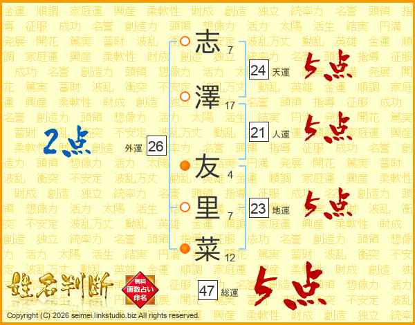志(7画)澤(17画) 友(4画)里(7画)菜(12画)