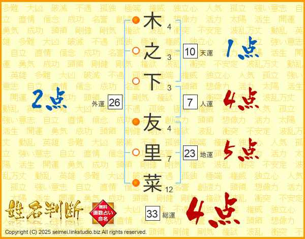 木(4画)之(3画)下(3画) 友(4画)里(7画)菜(12画)