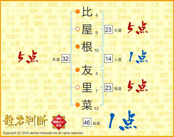 生活面を象徴する運勢です。外部から受ける影響力を表し、結婚運、家庭運や職場、環境への順応性を表します。総運から人運を引いた画数。姓や名が1文字の場合を除く。