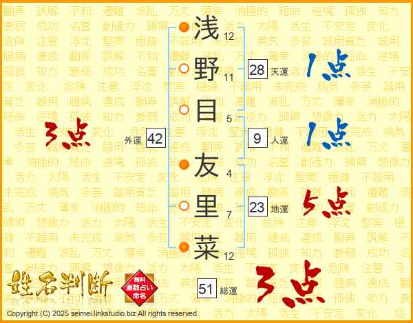 浅(12画)野(11画)目(5画) 友(4画)里(7画)菜(12画)