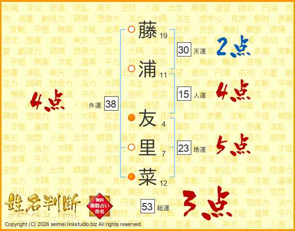 藤(19画)浦(11画) 友(4画)里(7画)菜(12画)