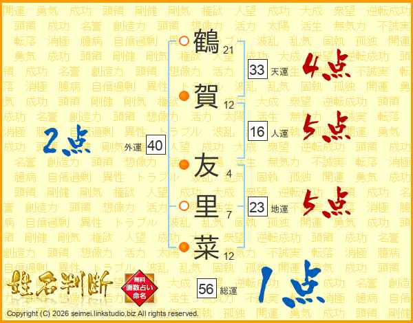 鶴(21画)賀(12画) 友(4画)里(7画)菜(12画)