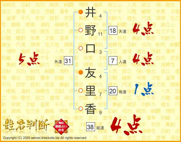 井(4画)野(11画)口(3画) 友(4画)里(7画)香(9画)